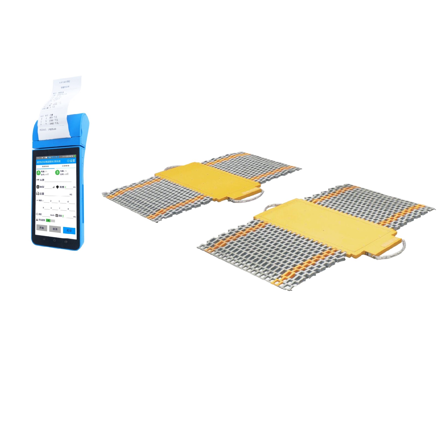 ①無線手持式帶打印儀表一塊、②無線稱重稱臺二塊、③引坡四塊、④標(biāo)準(zhǔn)附件(引橋、充電器、打印紙、色帶等)